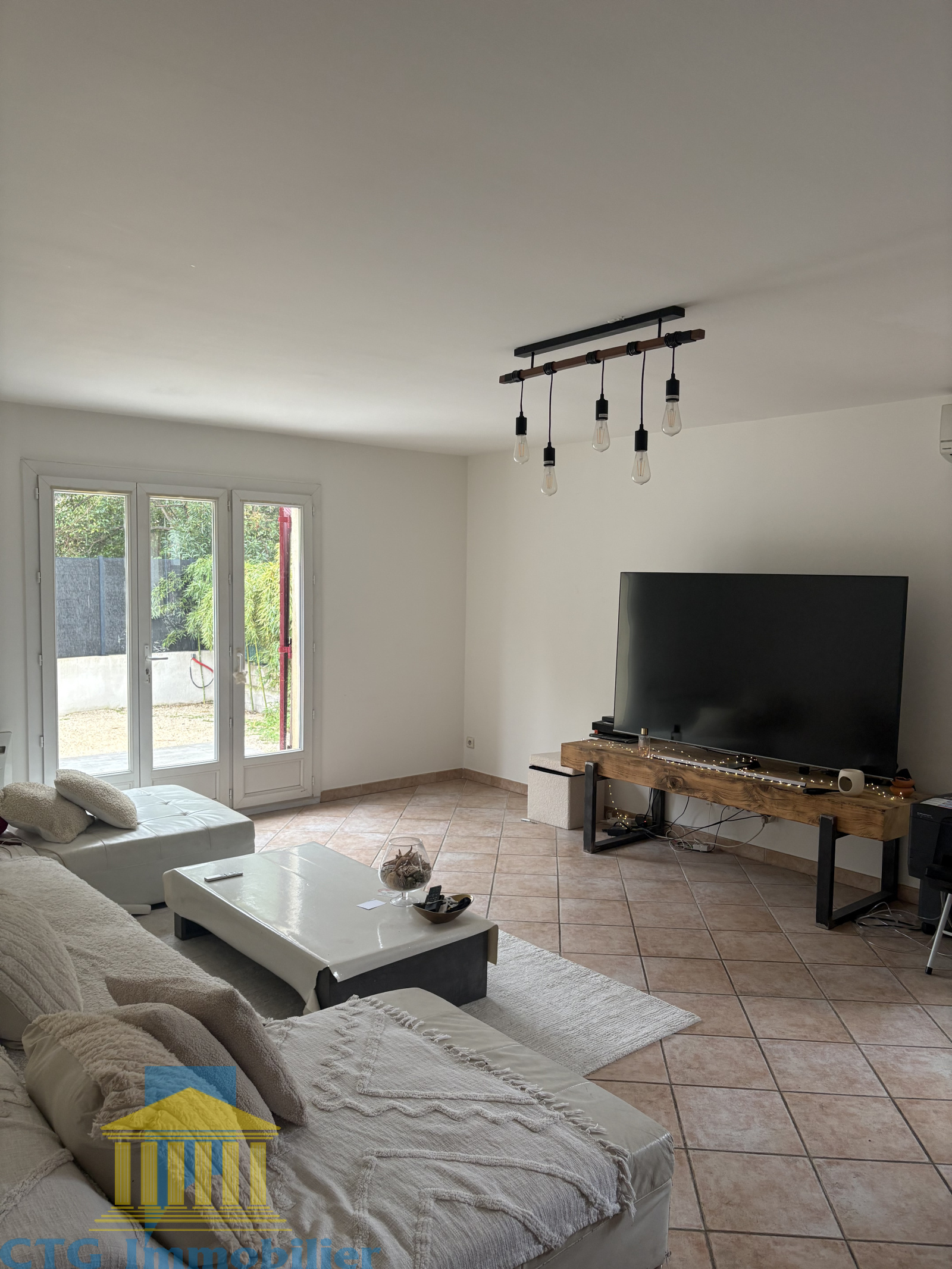 En premier plan,un immense séjour sur terrasse et jardin avec une cuisine séparée semi équipée, deux chambres, une salle de bain et un wc.